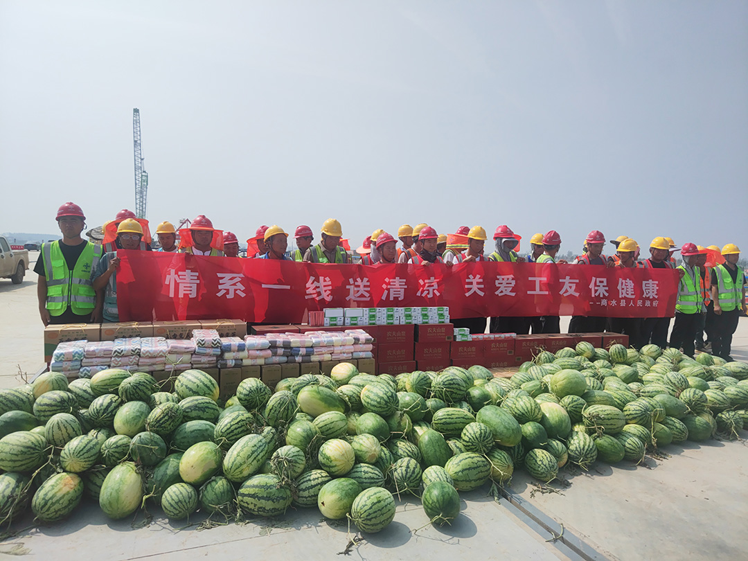 负责码头主体结构施工的李师傅领到慰问品后告诉记者:“这一段作业时间已经做出调整,避开午间高温时段,今天大伙都领到了西瓜和降暑物资,看到有这么多人关心、关注着自己,所以都愿意克服困难,争取早日完成建设任务。”